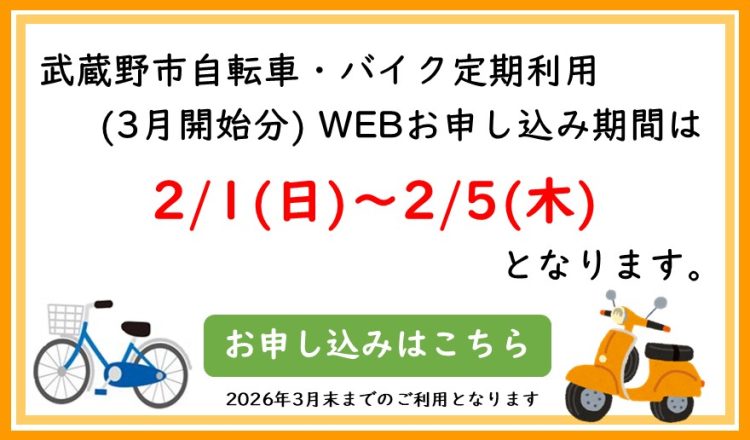 武蔵野市内自転車・バイク定期(3月利用開始分)の抽選お申込みが始まりました。 受付期間は2/1(日)~2/5(木)とな...