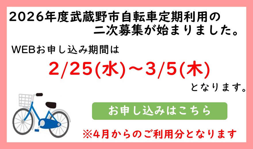 武蔵野市内自転車定期(2026年4月利用開始分)二次募集の抽選お申込みが始まりました。 お申し込み期間は2/25~3/5です。